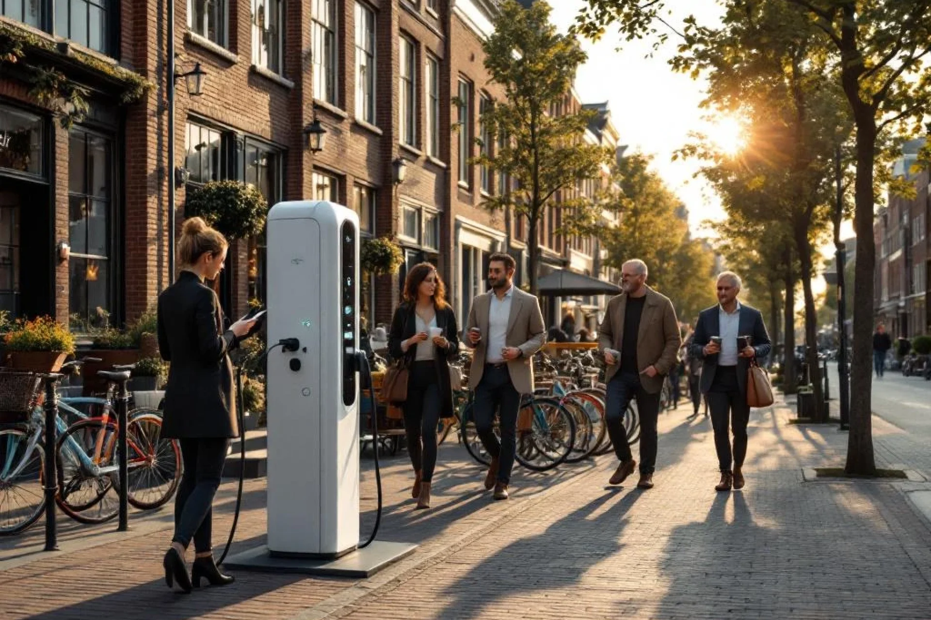 Elektrische laadpaal op Amsterdamse straat met historische bakstenen gebouwen en diverse voetgangers bij zonsondergang